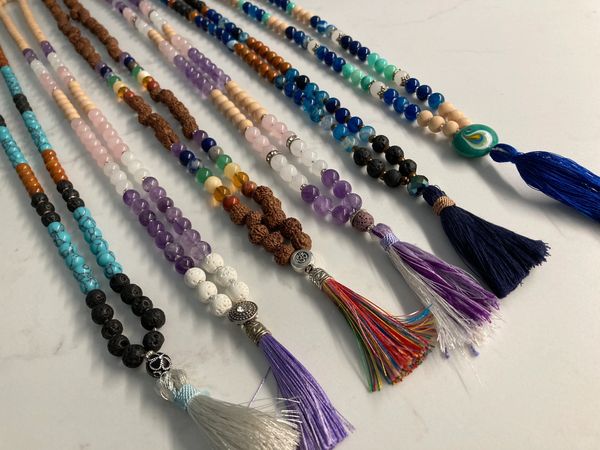 Mala beads are an effective tool in your meditation practice. Each mala necklace is made with 108 beads plus the guru bead. Beads made of wood, stone, and crystals contain various healing properties.