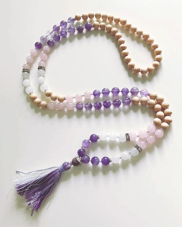 Many traditional malas are hand knotted between each bead. Other traditions have no knots in between, and some have spacing beads. I choose spacing beads to give the malas I create a little extra sparkle. The combination of mantra repetition and carrying the crystals near bring even more opportunity for mindfulness, growth, and balance.